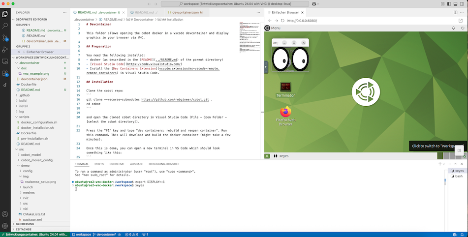 This folder allows opening the cobot docker in a vscode devcontainer and display graphics in your browser via VNC.